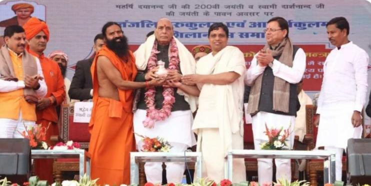 हरिद्वार। पतंजलि योगपीठ के 29वें स्थापना दिवस, पतंजलि योगपीठ महर्षि दयानन्द सरस्वती जी की 200वीं जयन्ती एवं गुरुकुल ज्वालापुर के संस्थापक स्वामी दर्शनानन्द जी की जयन्ती के अवसर पर देश के रक्षा मंत्री राजनाथ सिंह ने विश्व के श्रेष्ठतम गुरुकुल ‘पतंजलि गुरुकुलम’ व देश के श्रेष्ठतम शिक्षण संस्थान आचार्यकुलम् की नवीन शाखा का शिलान्यास किया।