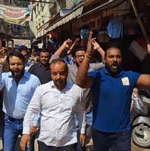 हरिद्वार। प्रदेश के मुख्यमंत्री पुष्कर सिंह धामी द्वारा आज हरकी पैड़ी के आसपास के बाजारों में जीएसटी बचत उत्सव कार्यक्रम के तहत दुकानदारों को जीएसटी कम होने के फायदे बताने पहुंचे मुख्यमंत्री पुष्कर सिंह धामी का महानगर कांग्रेस अध्यक्ष अमन गर्ग के नेतृत्व में कांग्रेसियों ने मुख्यमंत्री धामी गौ बैक, कारिडोर पर जवाब दो, जीएसटी की लूट का हिसाब दो, के नारे लगाते हुए हरिद्वार मंडी चौक से हरकी पैड़ी की तरफ कूच किया।