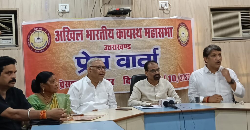 हरिद्वार। अखिल भारतीय कायस्थ महासभा उत्तराखण्ड द्वारा भगवान श्री चित्रगुप्त कथा द्वितीय वर्ष का आयोजन 4-5 अक्टूबर 25 को श्री चित्रकूट आश्रम के घाट भूपतवाला हरिद्वार में किया जा रहा है। इस कार्यक्रम में मुम्बई से फिल्मी दुनिया के कई हास्तियों के साथ-साथ देश के विभिन्न प्रांतों से भारी संख्या में कायस्थ समाज के लोग शामिल होगे। यह आयोजन धार्मिक आस्था, संस्कृतिक एकता और समाज में कर्तव्यबोध के संदेश को आगे बढाने का एक सतत प्रयास है। इस बात की जानकारी अखिल भारतीय कायस्थ महासभा के प्रदेशाध्यक्ष संजय श्रीवास्तव ने प्रेस क्लब हरिद्वार में पत्रकार वार्ता के दौरान दी।