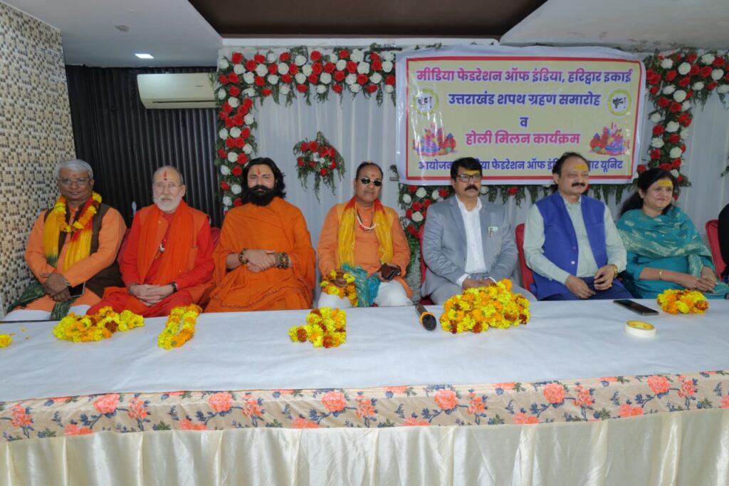 हरिद्वार। मीडिया जगत को संगठित और सशक्त बनाने के उद्देश्य से मीडिया फेडरेशन ऑफ इंडिया की हरिद्वार इकाई उत्तराखंड का भव्य शपथ ग्रहण समारोह व होली मिलन कार्यक्रम ज्वालापुर स्थित एक होटल में हर्षाेल्लास के साथ आयोजित किया गया। कार्यक्रम में मुख्य अतिथि के रूप में फेडरेशन के राष्ट्रीय अध्यक्ष अरुण शर्मा की गरिमामयी उपस्थिति रही। कार्यक्रम का शुभारंभ मुख्य अतिथि द्वारा दीप प्रज्ज्वलन से किया गया। इसके उपरांत हरिद्वार इकाई के संरक्षक डॉ. अर्जुन नागयान व जिलाध्यक्ष योगेश कुमार शर्मा ने बुके और पुष्पमाला भेंट कर राष्ट्रीय अध्यक्ष का स्वागत व अभिनंदन किया।