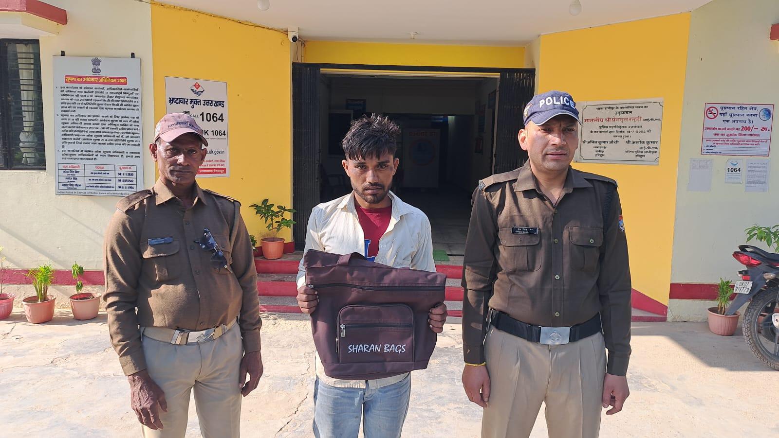 कोतवाली रानीपुर प्रभारी निरीक्षक नरेन्द्र सिंह बिष्ट ने बताया कि श्रीमति महेश्वरी शाह पत्नी स्व. आनंद लाल निवासी शिवालिकनगर रानीपुर हरिद्वार ने 21 अक्टूबर को तहरीर देकर शिकायत की थी। शिकायत में कहा गया था कि सेक्टर-01 स्थित एसबीआई पार्क के पास बाइक सवार दो युवक उसके हाथ से बैंग झपटकर फरार हो गये। पर्स में एक मोबाइल, आधार कार्ड, पासबुक समेत अन्य समान मौजूद था। पुलिस ने तहरीर के आधार पर अज्ञात बाइक सवारों के खिलाफ मुकदमा दर्ज करते हुए तलाश शुरू कर दी। पुलिस ने क्षेत्र में लगे सीसीटीवी कैमरों की मदद से बाइक सवारों की शिनाख्त के प्रयास करते हुए तलाश में जुट गयी। इसी दौरान पुलिस ने मुखबिर की सूचना पर बीती शाम को चिन्मय डिग्री कॉलेज के पास बैंग झपटमार एक आरोपी को दबोच लिया।
