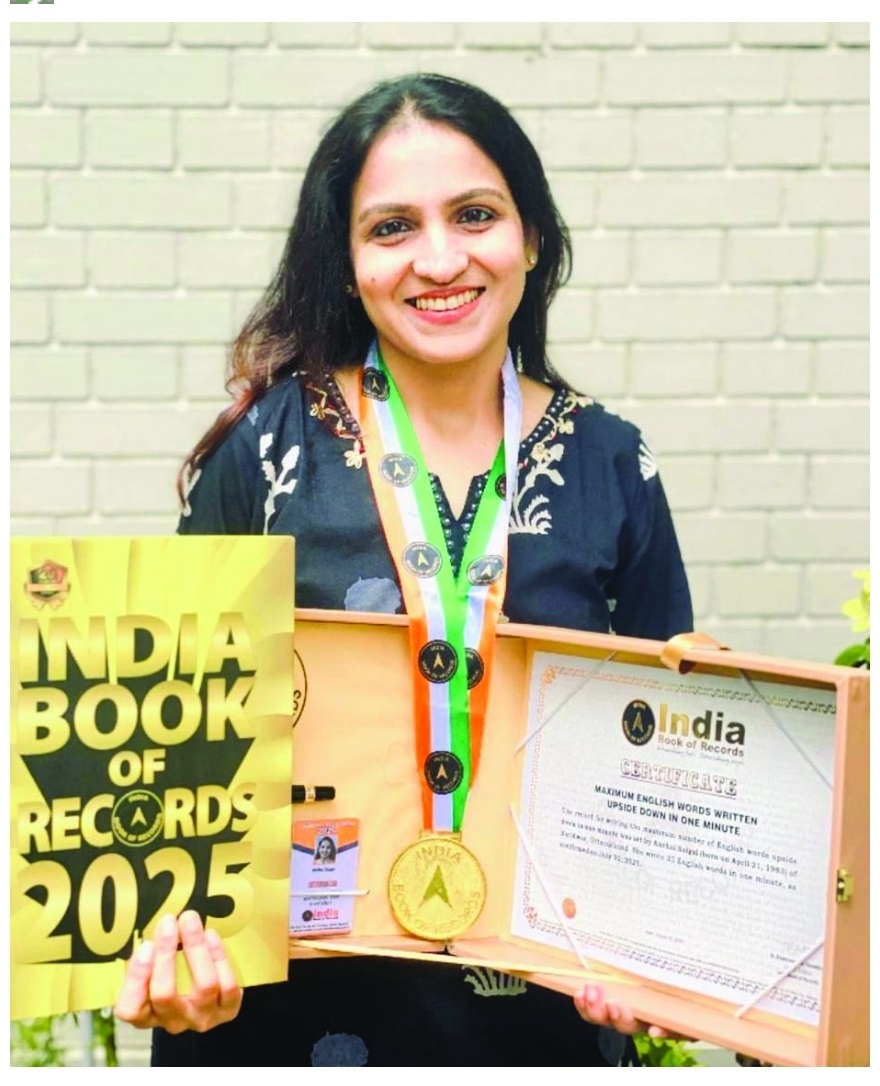 हरिद्वार। इंडिया बुक आफॅ रिकार्ड में अपना नाम दर्ज कराने वाली शहर के प्रतिष्ठित कारोबारी घराने व समाजसेवी की पुत्रवधू श्रीमति आंचल सहगल ने परिवार और शहर का नाम रोशन किया है। श्रीमति आंचल सहगल को यह सम्मान अप्स एंड डाऊन इग्लिश वर्णमाला के शब्दों को लिखने के लिए दिया गया। यह रिकार्ड उन्होंने एक मिनट में 33 शब्द लिखकर हासिल किया है, जबकि इससे पूर्व में 29 शब्दों का रिकार्ड दर्ज है।