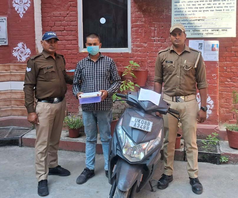 कोतवाली नगर प्रभारी निरीक्षक रितेश शाह ने बताया कि बीती शाम पुलिस का एक गश्ती दल क्षेत्र में गश्त पर था। इसी दौरान पुलिस के गश्ती दल को ऋषिकुल पुल के पास नहर पटरी पर स्कूटी सवार एक संदिग्ध को रोकने का सकेंत दिया। लेकिन स्कूटी सवार पुलिस के सकेंत को नजर अदांज कर स्कूटी को वापस मोड कर भागने का प्रयास किया। जिसपर शक होने पर पुलिस ने उसका पीछा किया। इसी दौरान नहर पटरी पर पड़ी बंजरी में स्कूटी फिसल कर संदिग्ध गिर पड़ा।
