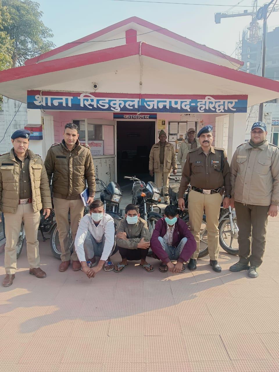 हरिद्वार। सिडकुल पुलिस ने बुधवार की शाम को क्षेत्र में चैकिंग के दौरान दो चोरी की बाइकों के साथ तीन को दबोचा है। पुलिस ने आरोपियों की निशानदेही से चोरी की चार और बाइकों को बरामद किया है। बाइक चोरों से बरामद की गयी 6 बाइकों से 05 बाइके सिडकुल क्षेत्र से चोरी करना स्वीकार किया है। जबकि एक बाइक की जानकारी जुटाई जा रही है। पुलिस ने आरोपियों के खिलाफ सम्बंधित धाराओं में मामला दर्ज कर लिया। जिनको मेडिकल के बाद न्यायालय में पेश कर जेल भेज दिया।