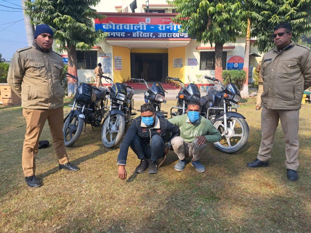 हरिद्वार। कोतवाली रानीपुर पुलिस ने क्षेत्र में चैकिंग के दौरान क्षेत्र से चोरी की गयी बाइक के साथ दो आरोपियों को दबोचा है। जिनकी निशानदेही से चोरी की चार और बाइके भी बरामद की है। पुलिस ने आरोपियों के खिलाफ सम्बंधित धाराओं में मामला दर्ज कर लिया। जिनको मेडिकल के बाद न्यायालय में पेश कर जेल भेज दिया।